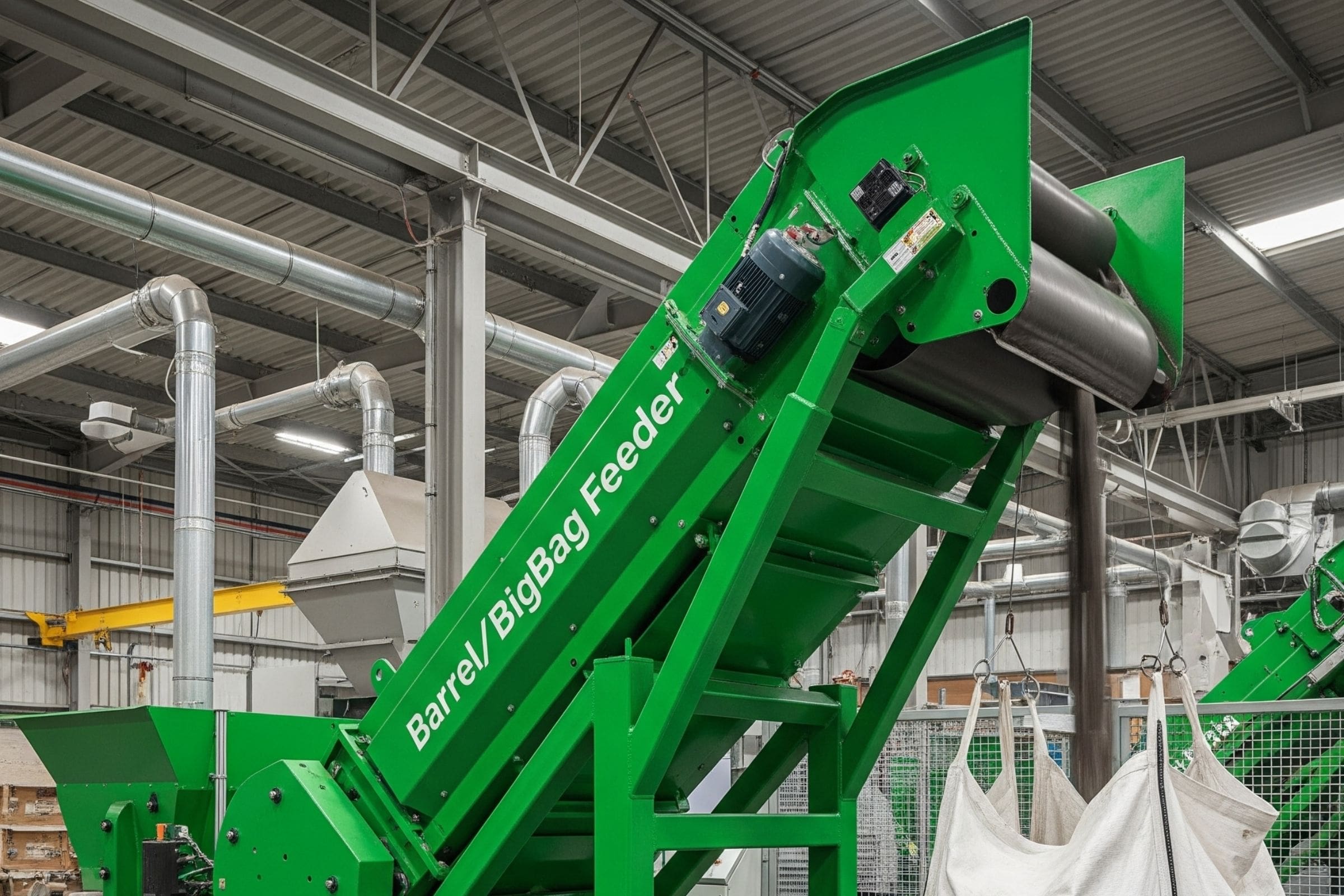 This feeder system offers several operational advantages. It provides flexibility by being compatible with both drums and Bigbags, making it adaptable to various feedstock packaging formats. Its ability to deliver stable material flow enhances process efficiency and minimizes fluctuations that could disrupt downstream equipment. Its enclosed design significantly reduces dust emissions and improves workplace safety. The unit is also designed for easy integration with crushers, sieving units, or pneumatic conveying systems through modular inlet and outlet interfaces.