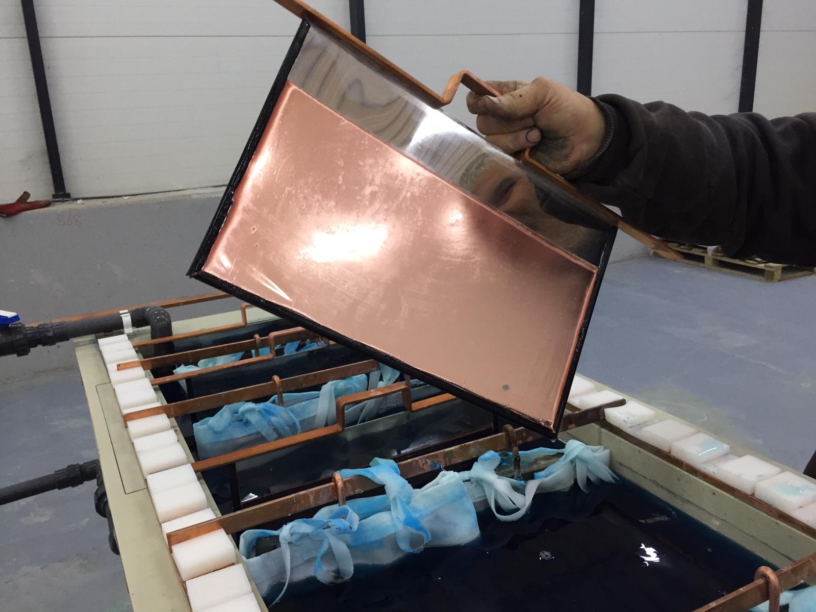 Copper found in wastes, scraps and ores can be produced in high purity with electrolysis units after the necessary chemical processes are applied. The form of the starting material is changed by hydrometallurgical or pyrometallurgical processes. If necessary, physical processes are carried out to increase the copper concentration of the sludge. The material obtained as a result of all chemical and physical pre-processes is fed to the electrolysis system and 99.99% pure copper is produced. High purity copper is easily collected from cathodes. It is obtained in ready-to-sell form.