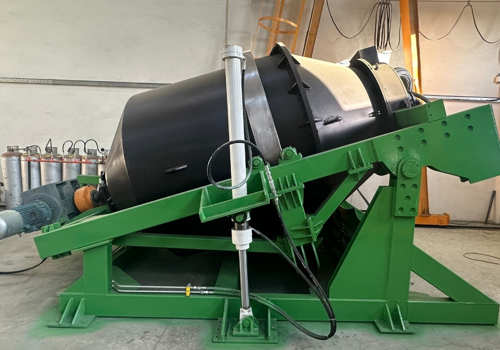 The furnace consists of a rotating drum with a special drive and bearing system on the chassis, and it includes hydraulic tilting. Liquid metal is poured from the furnace door by tilting the furnace. The burner system and stack are located on the hydraulic opening-closing door. It also has a rotatable and tiltable reaction vessel capable of heating residues to temperatures above 1500 °C through oxygen burners, facilitating efficient material separation and recovery.